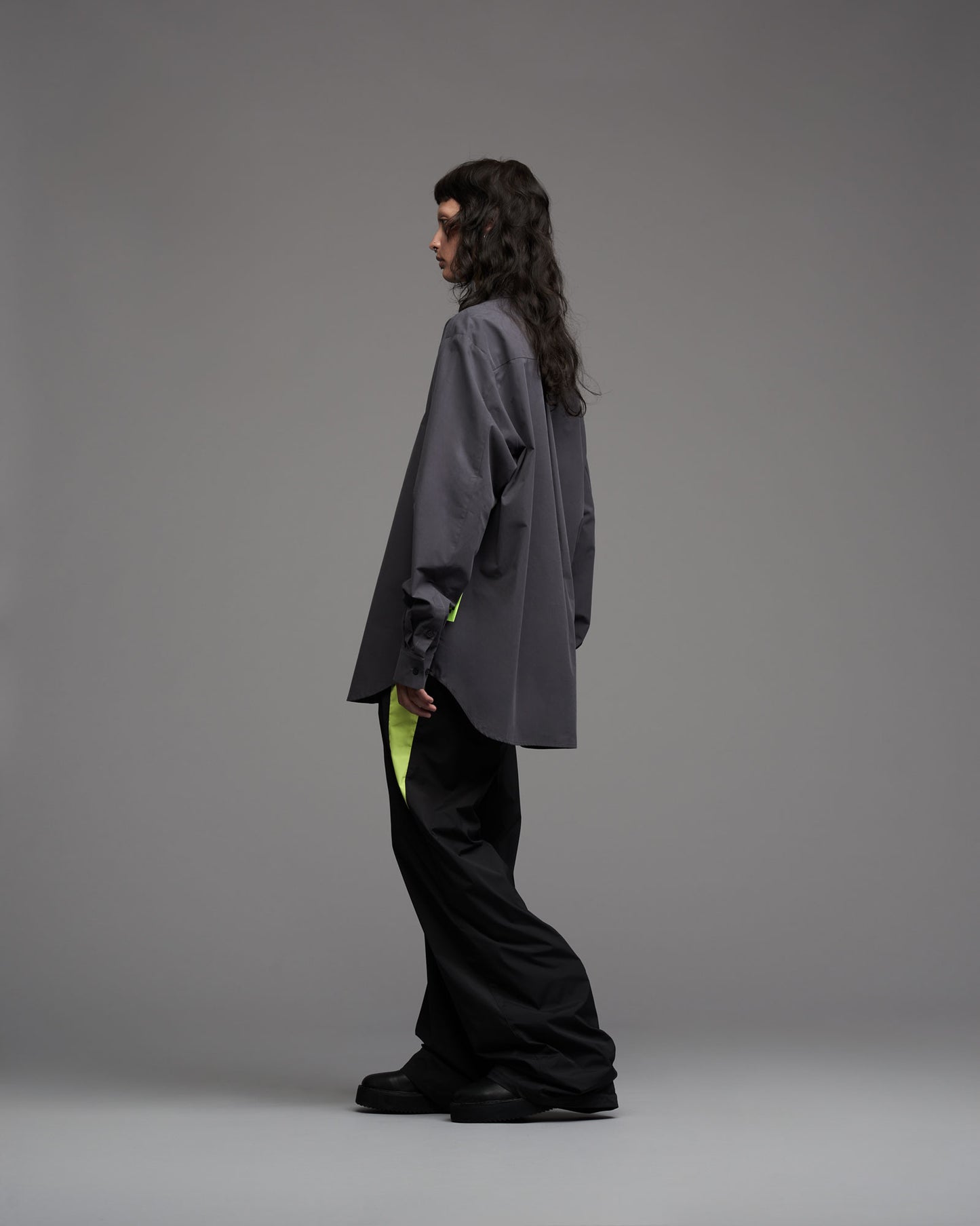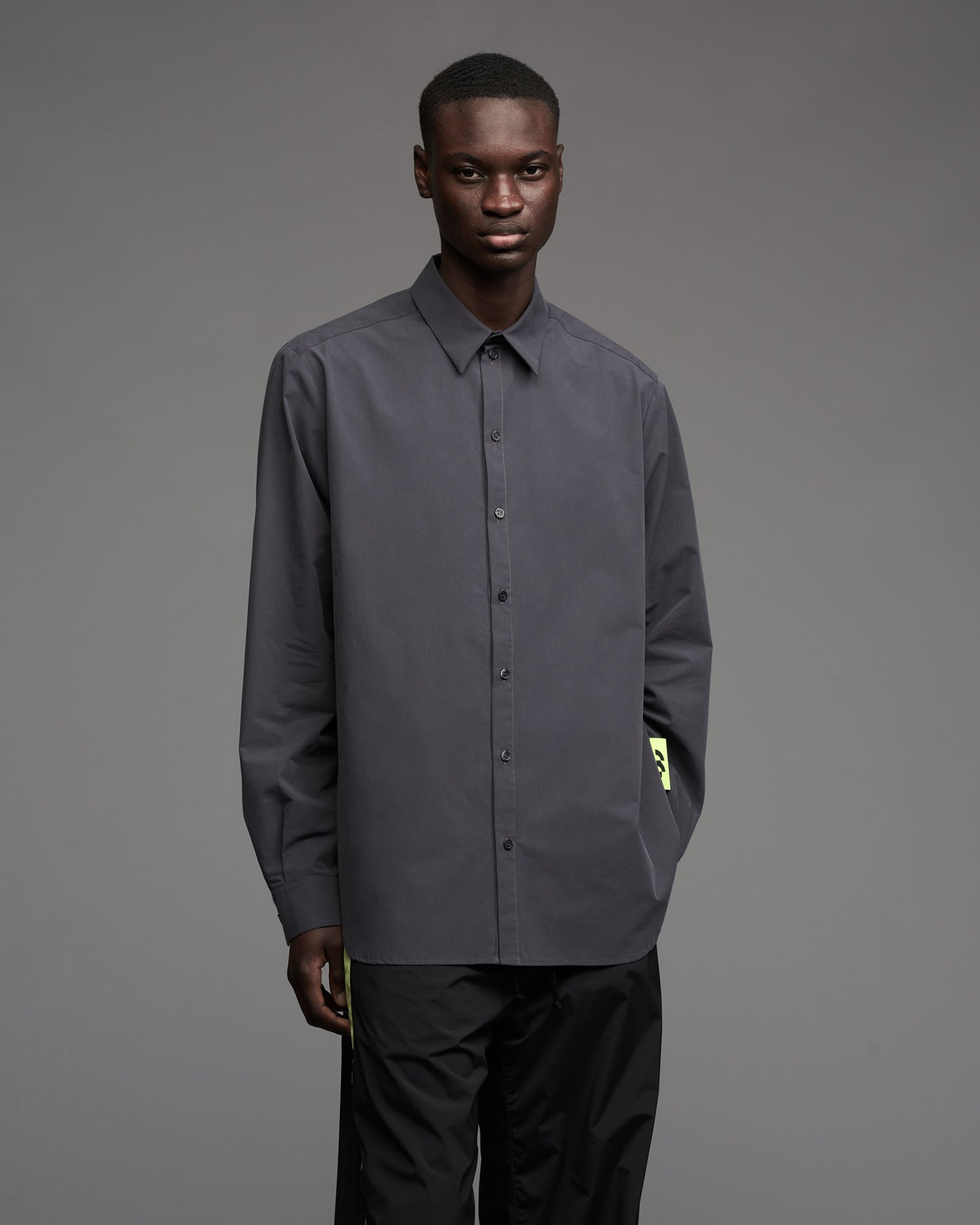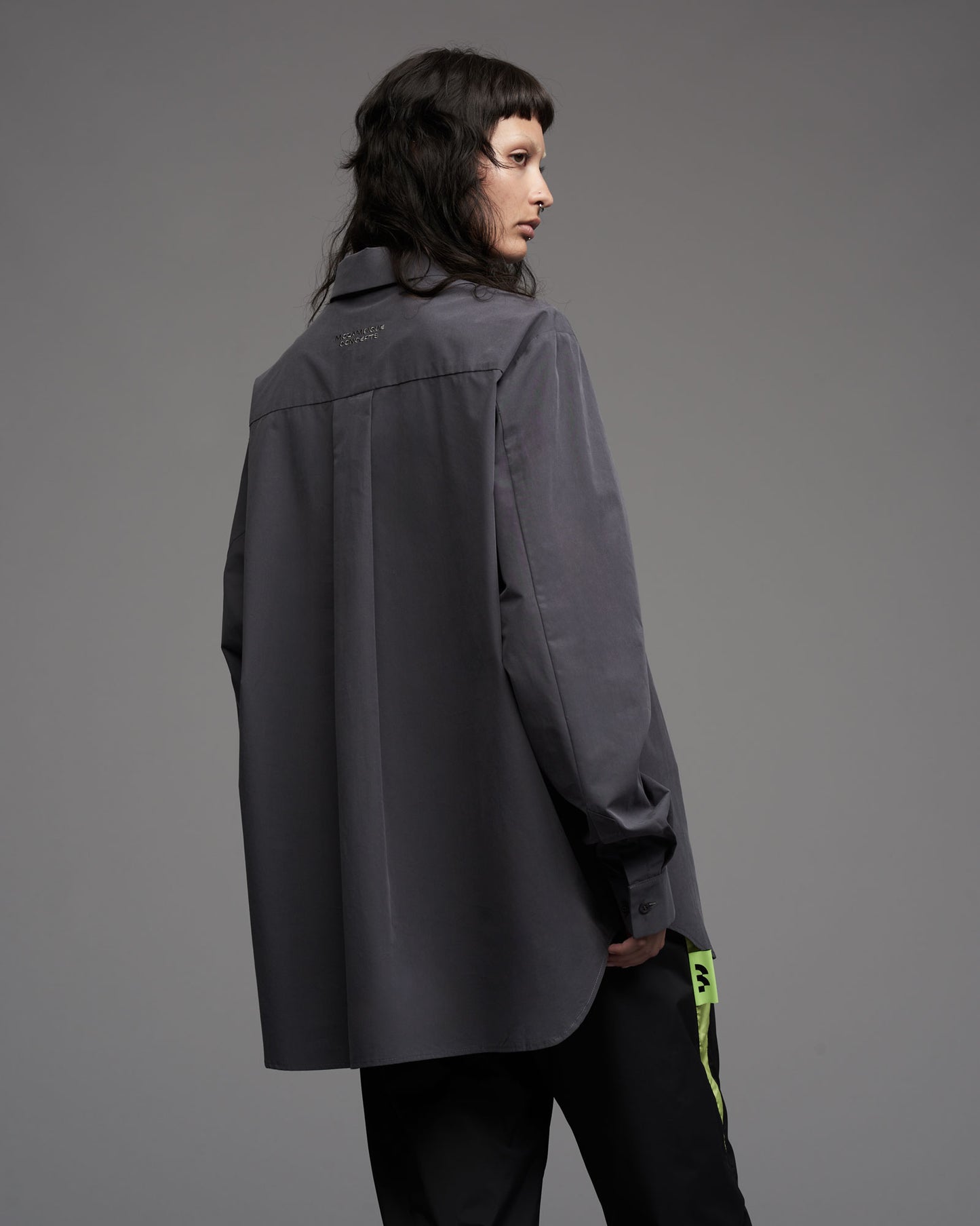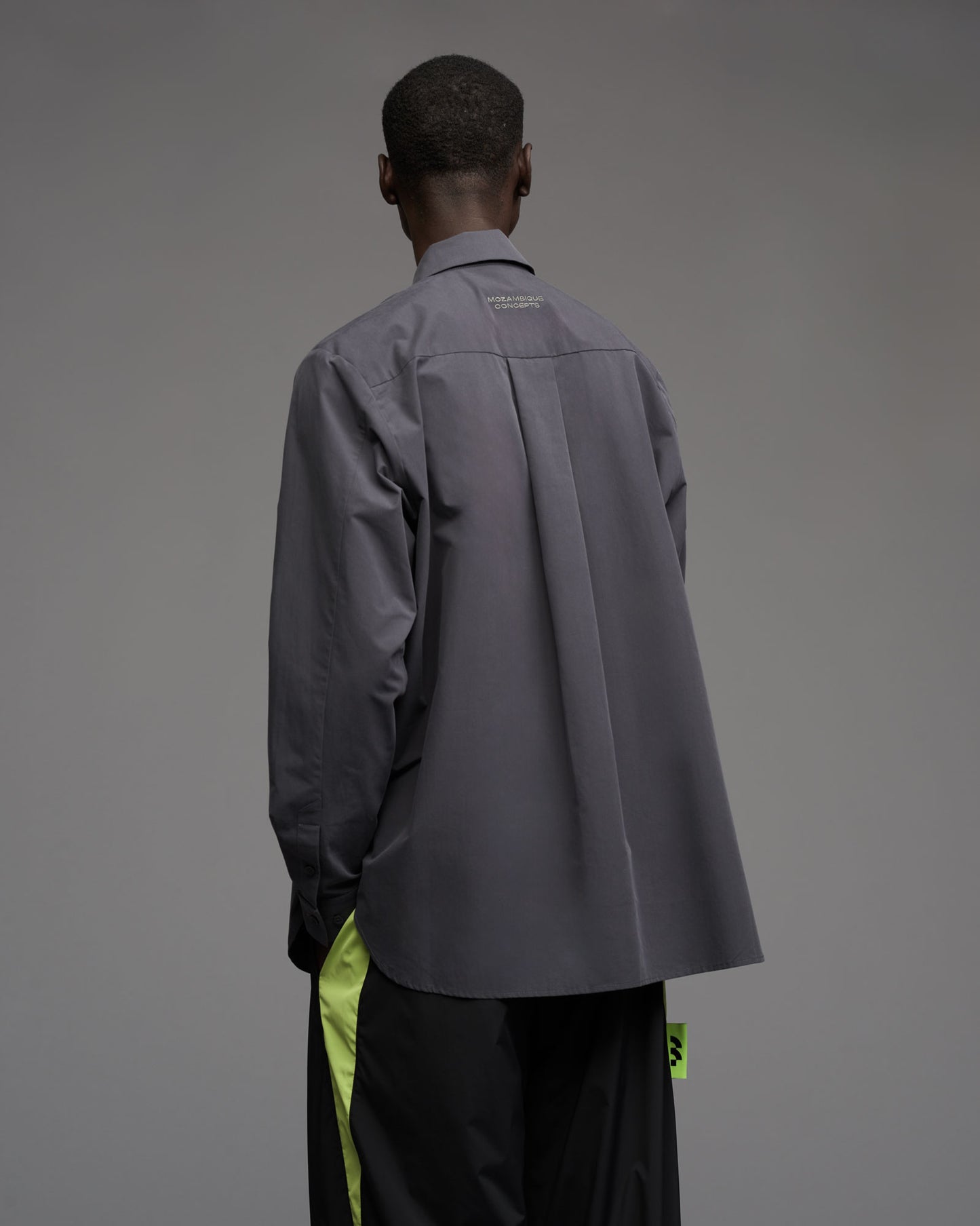 Slightly oversized shirt organic cotton fabric. Regular shirt buttons over front and in sleeves. Mozambique x Concepts embroidery tone in tone in back of neck. Mozambique x Concepts neon collaboration flag label stiched in left side seam.
