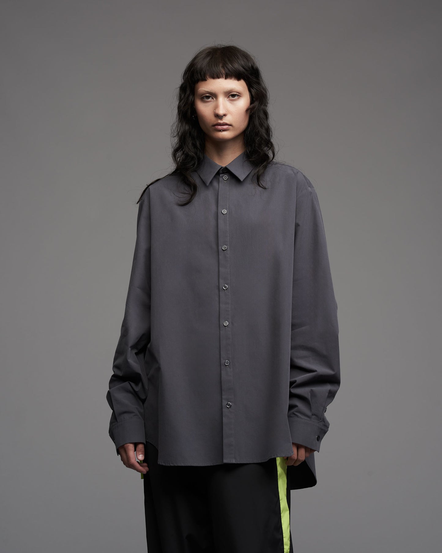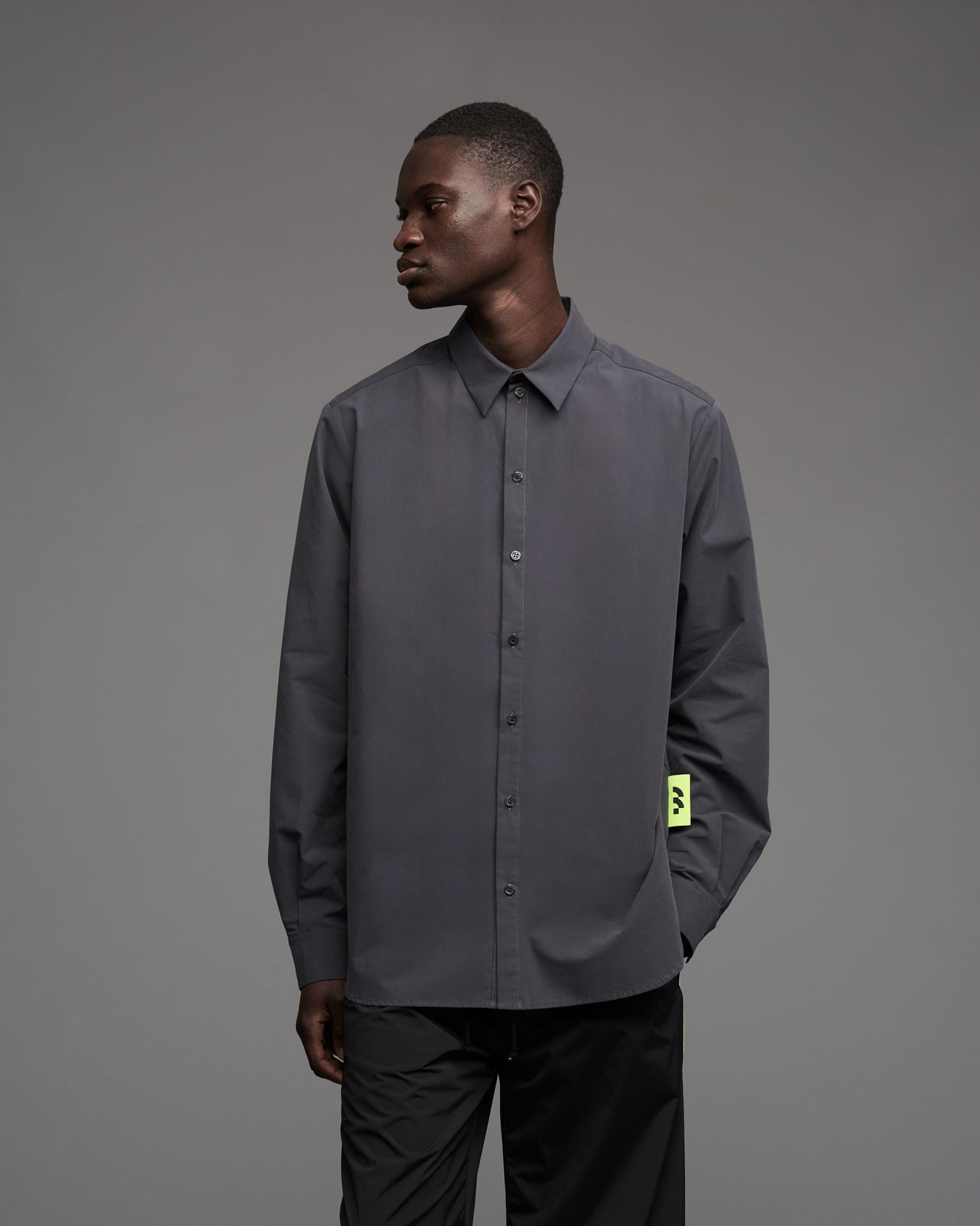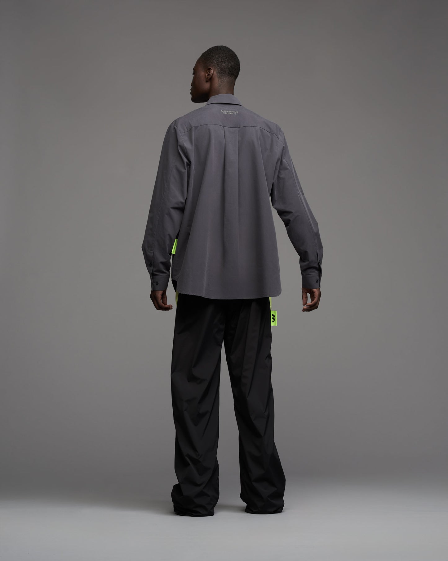 Slightly oversized shirt organic cotton fabric. Regular shirt buttons over front and in sleeves. Mozambique x Concepts embroidery tone in tone in back of neck. Mozambique x Concepts neon collaboration flag label stiched in left side seam.