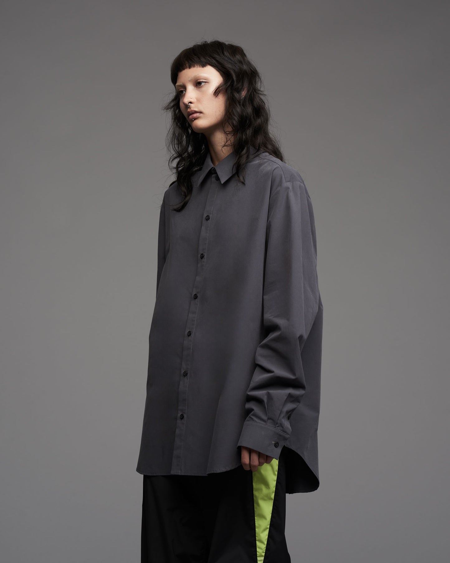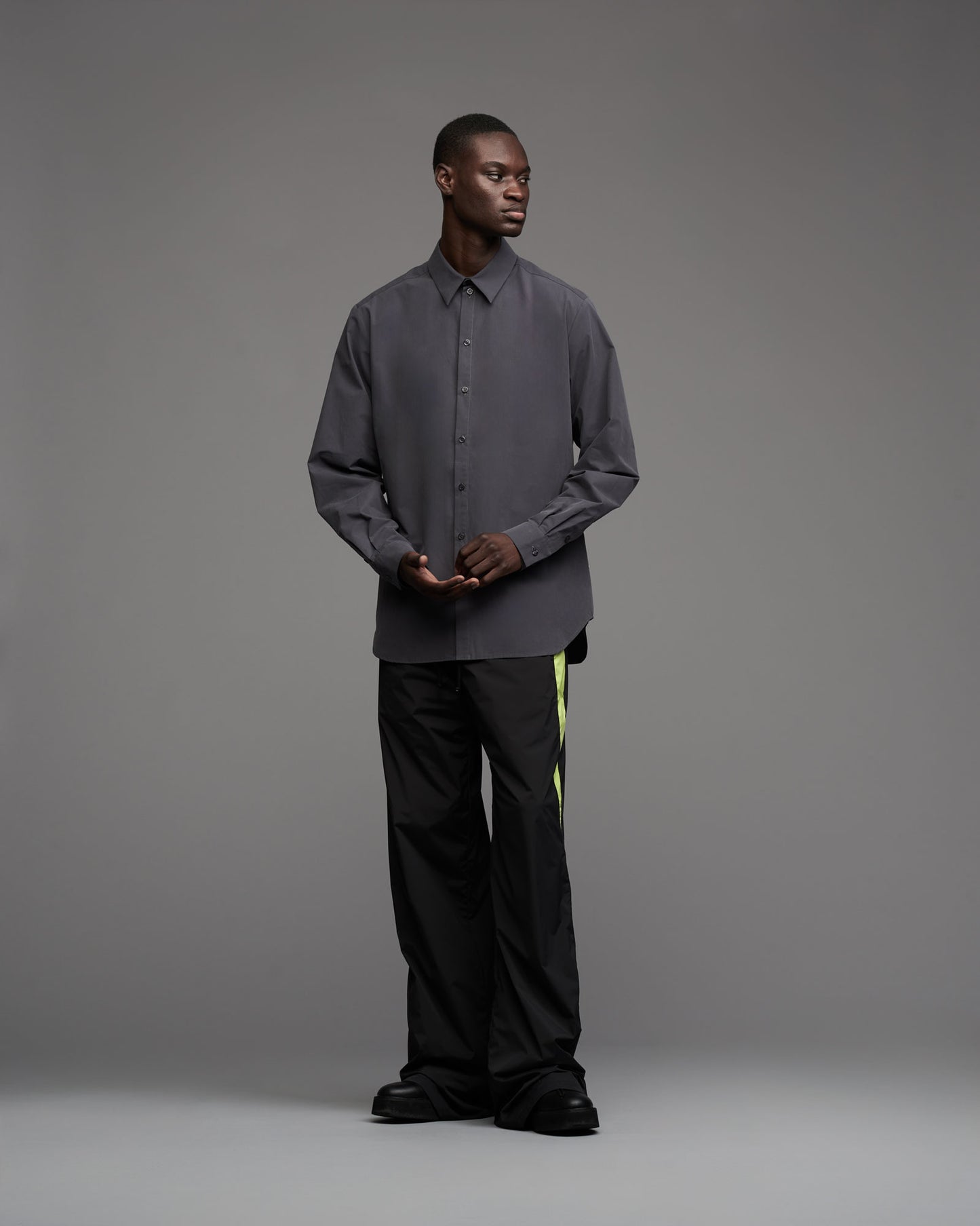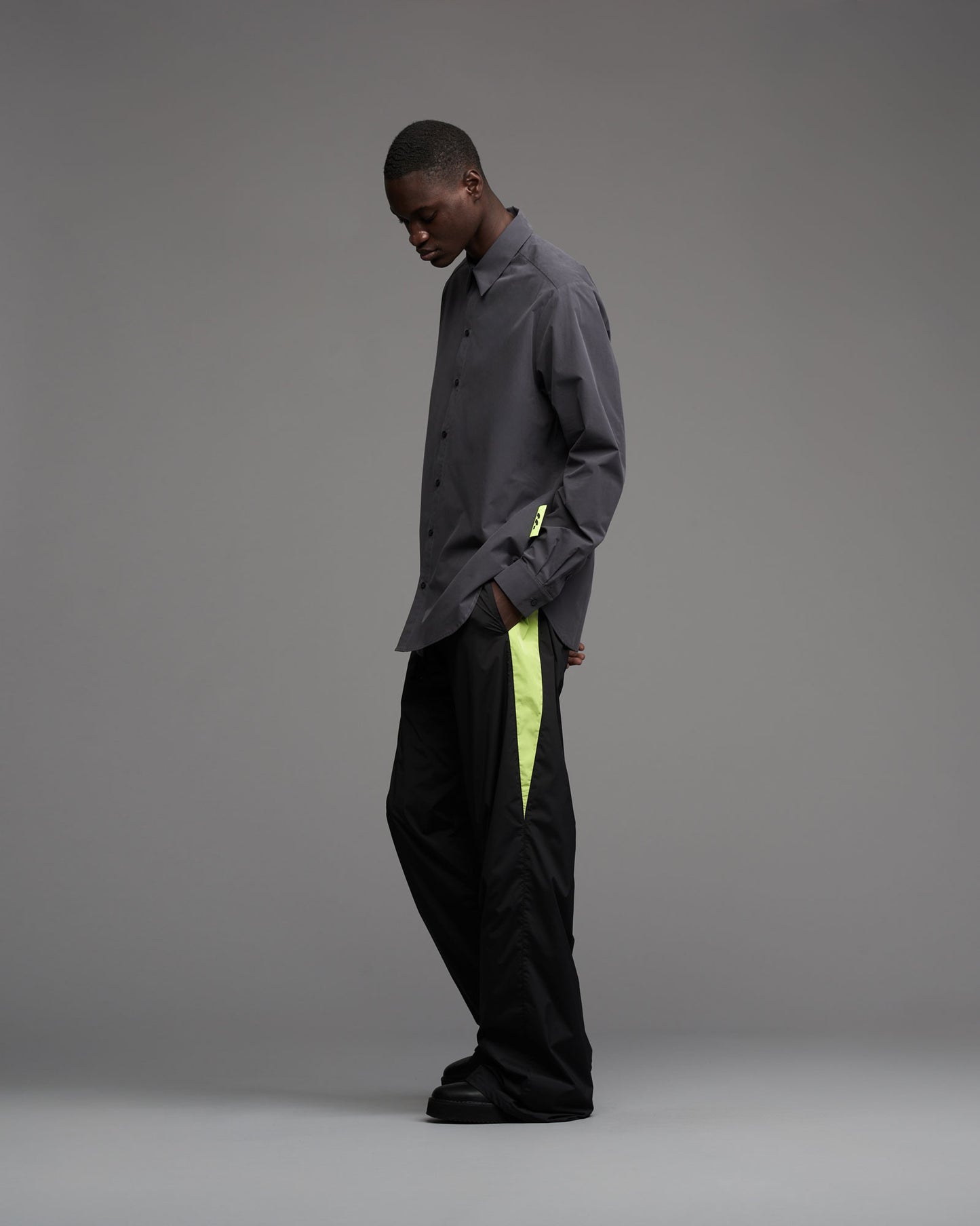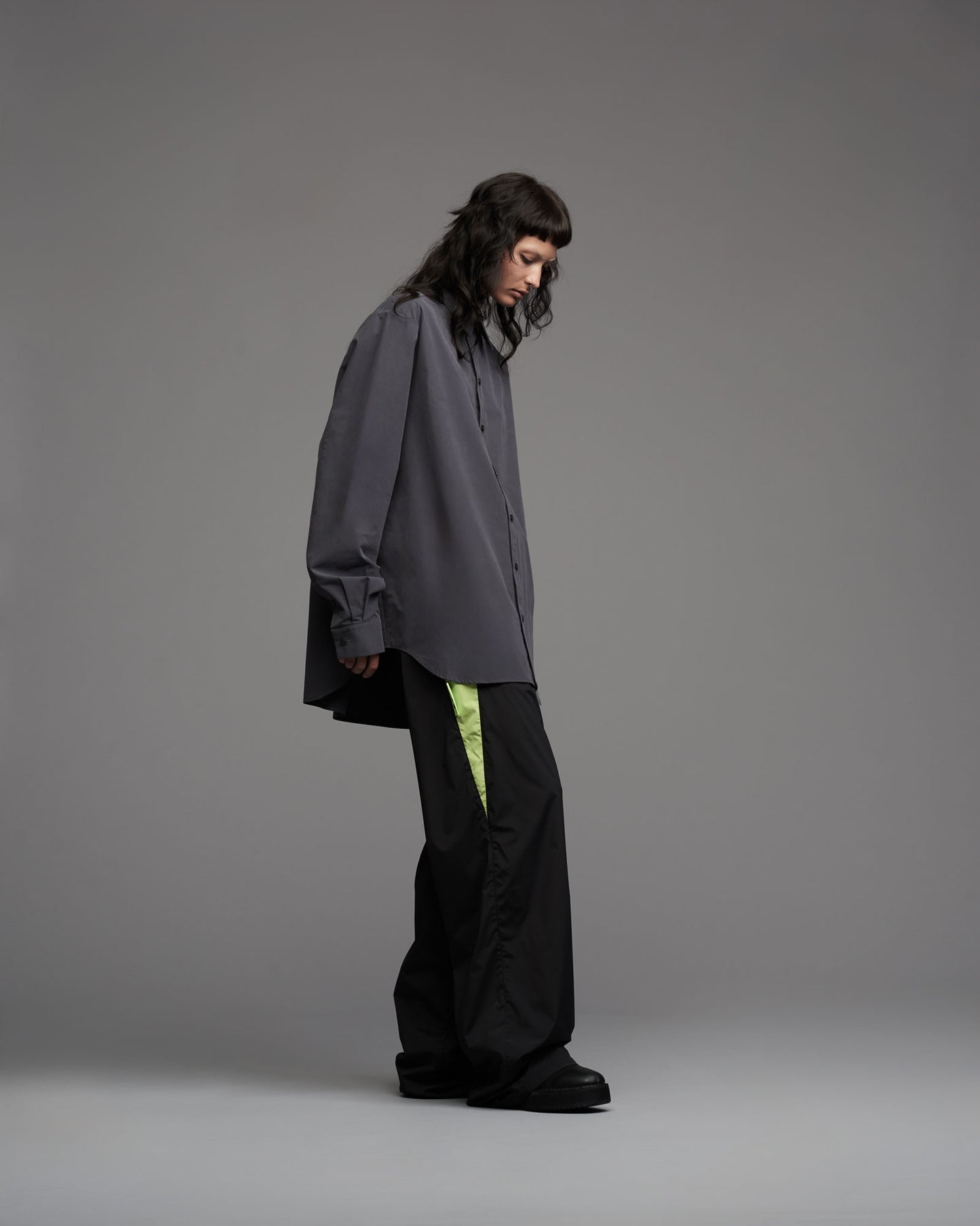 Slightly oversized shirt organic cotton fabric. Regular shirt buttons over front and in sleeves. Mozambique x Concepts embroidery tone in tone in back of neck. Mozambique x Concepts neon collaboration flag label stiched in left side seam.