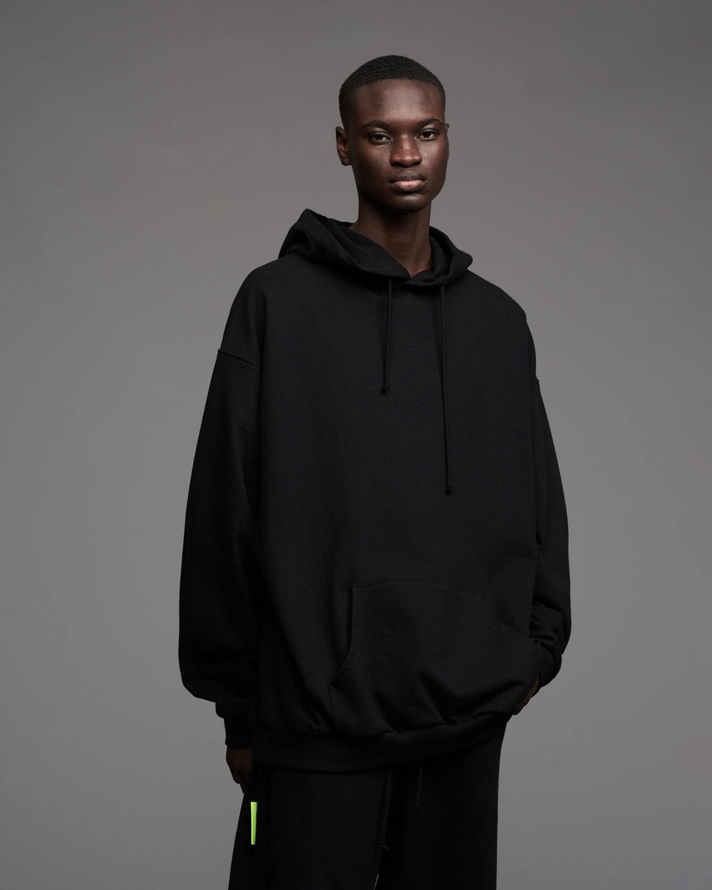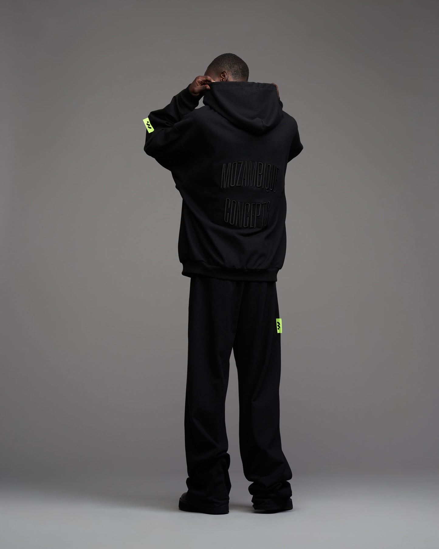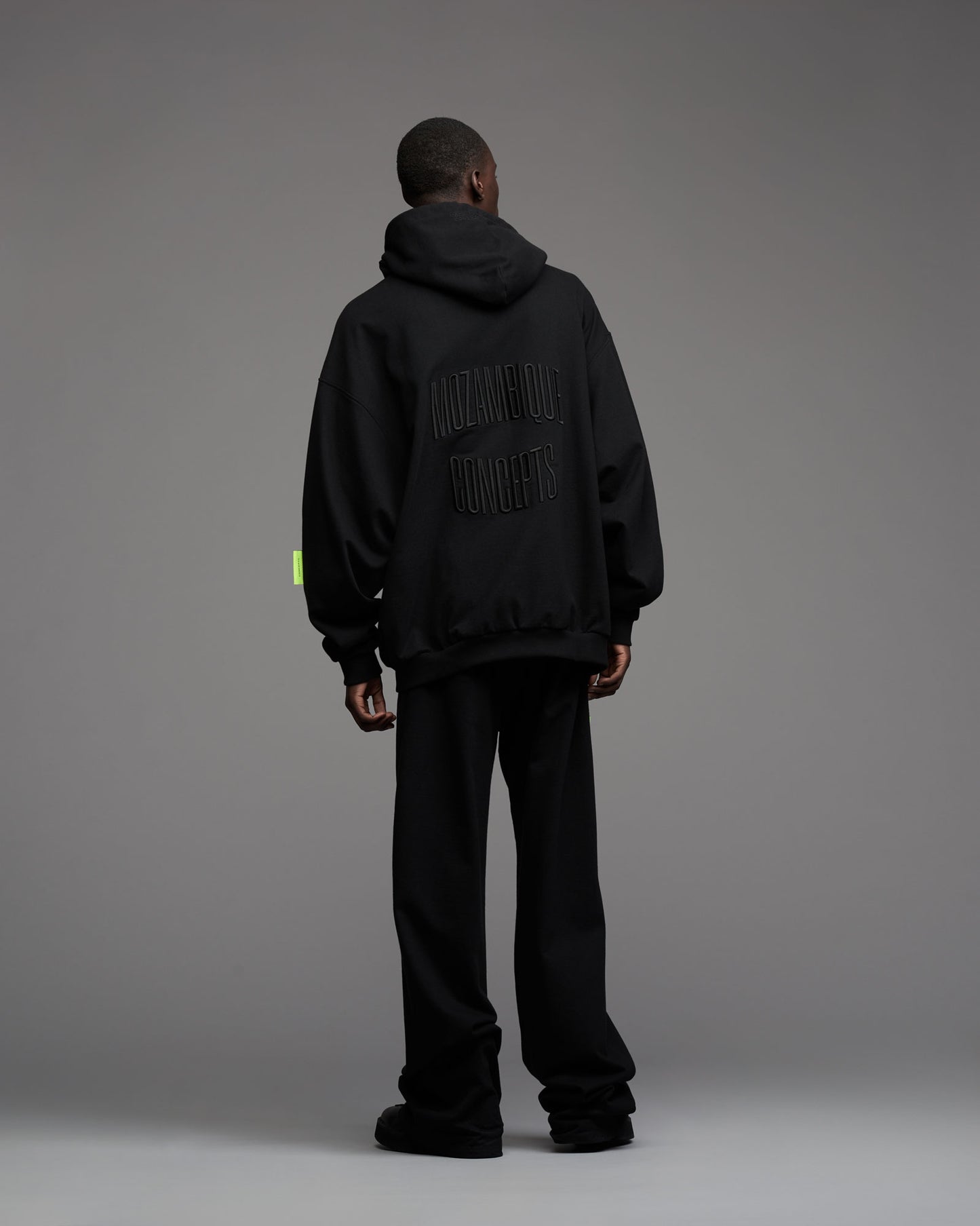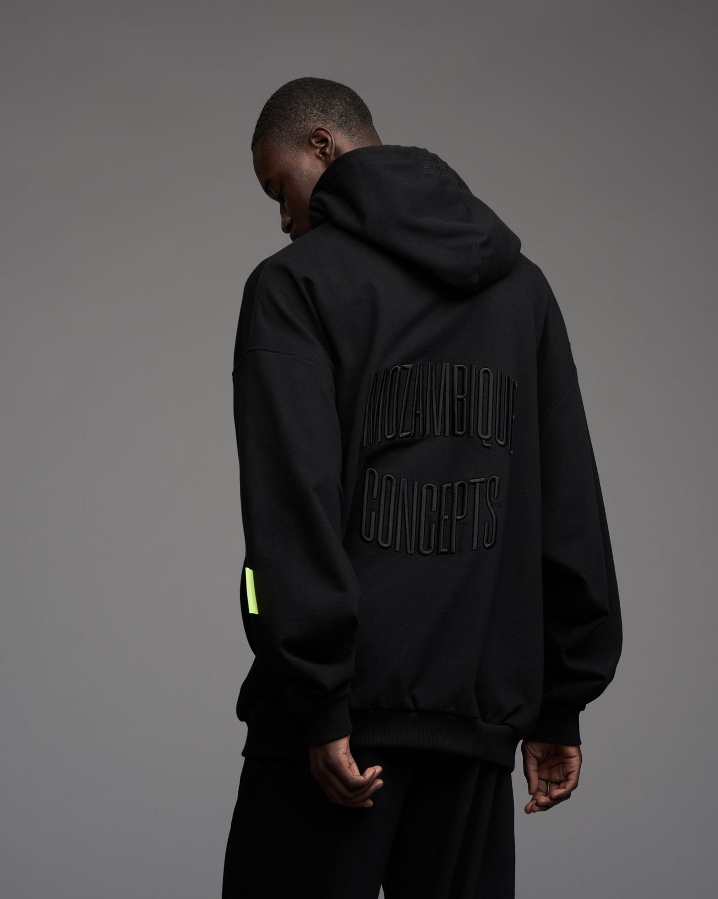 Oversized hooded sweatshirt in organic heavy terry cotton. Tone in tone cord with knot endings in hood. Pocket in front. "Mozambique Concepts" embroidery over back. Double stitched over shoulders and neck. Mozambique x Concepts embroidery tone in tone over front of hood. Mozambique x Concepts neon collaboration flag label stiched in left sleeve side seam.