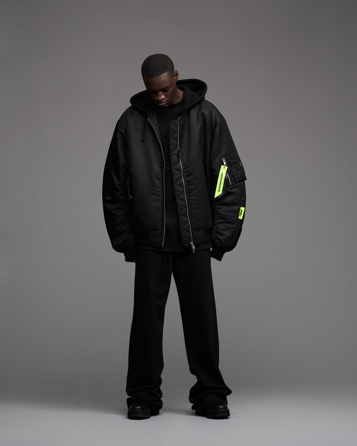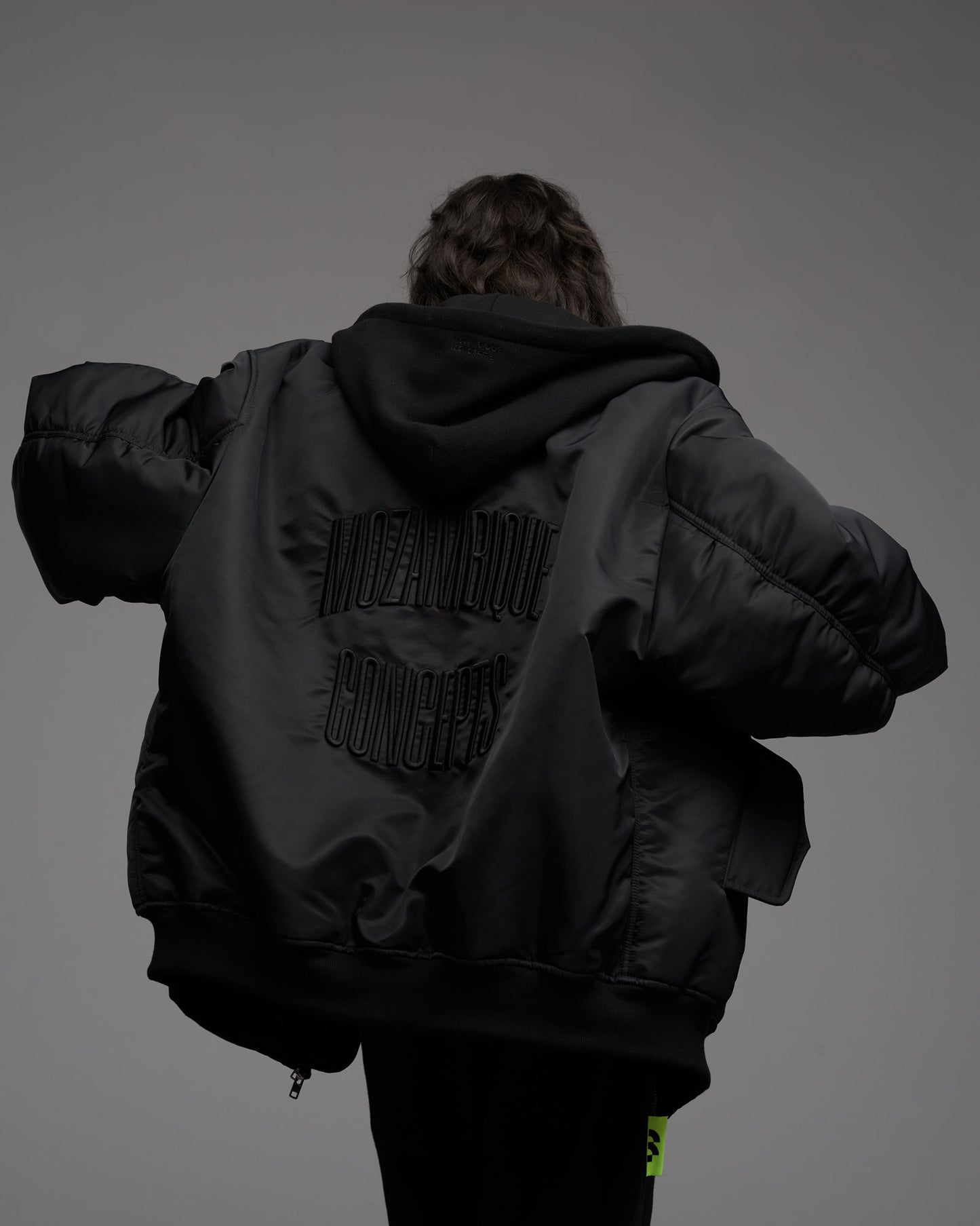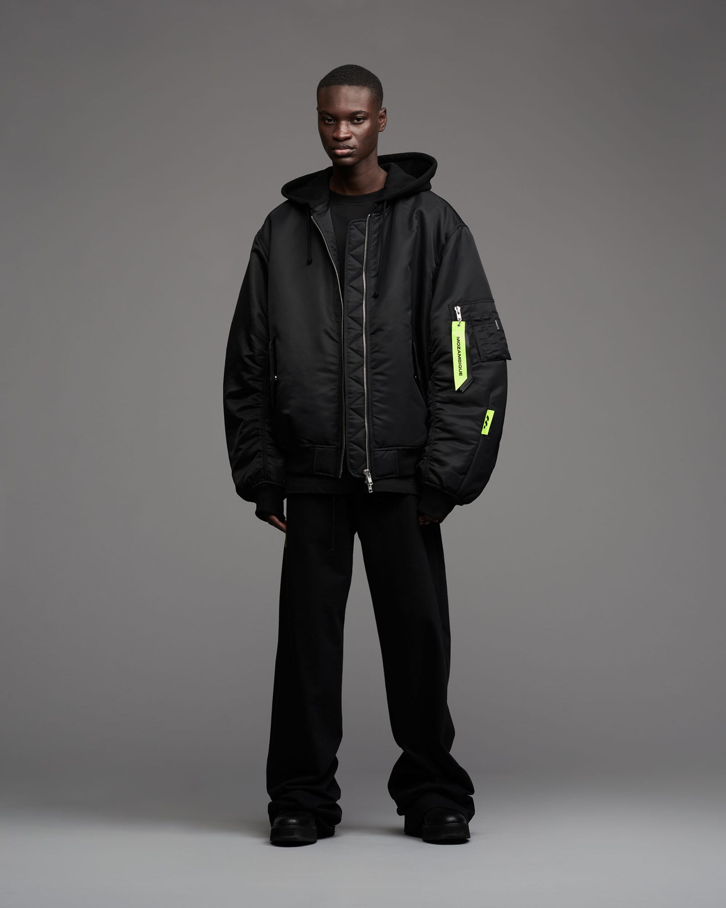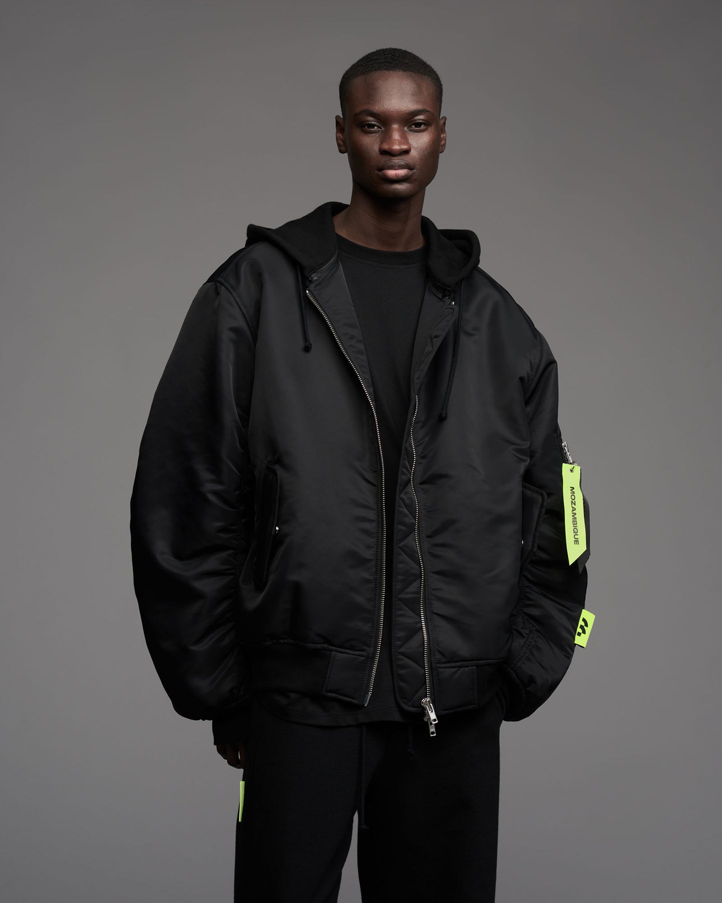 Oversized, padded bomber jacket in recycled tech fabric. Fully lined with inner pockets. Silver metallic two-way zipper in front. Multistitched inner placket. Detachable sweatshirt fabric hood. Tone in tone cord with knot endings in hood. "Mozambique Concepts" embroidery over back. Mozambique x Concepts embroidery tone in tone over front of hood. Mozambique x Concepts neon collaboration flag label stiched in left sleeve side seam. Sleeve pocket with "Mozambique", "Concepts" and "d'Odeur" zipper pullers printed on neon and black. Two front welt pockets. Rib cuffs.