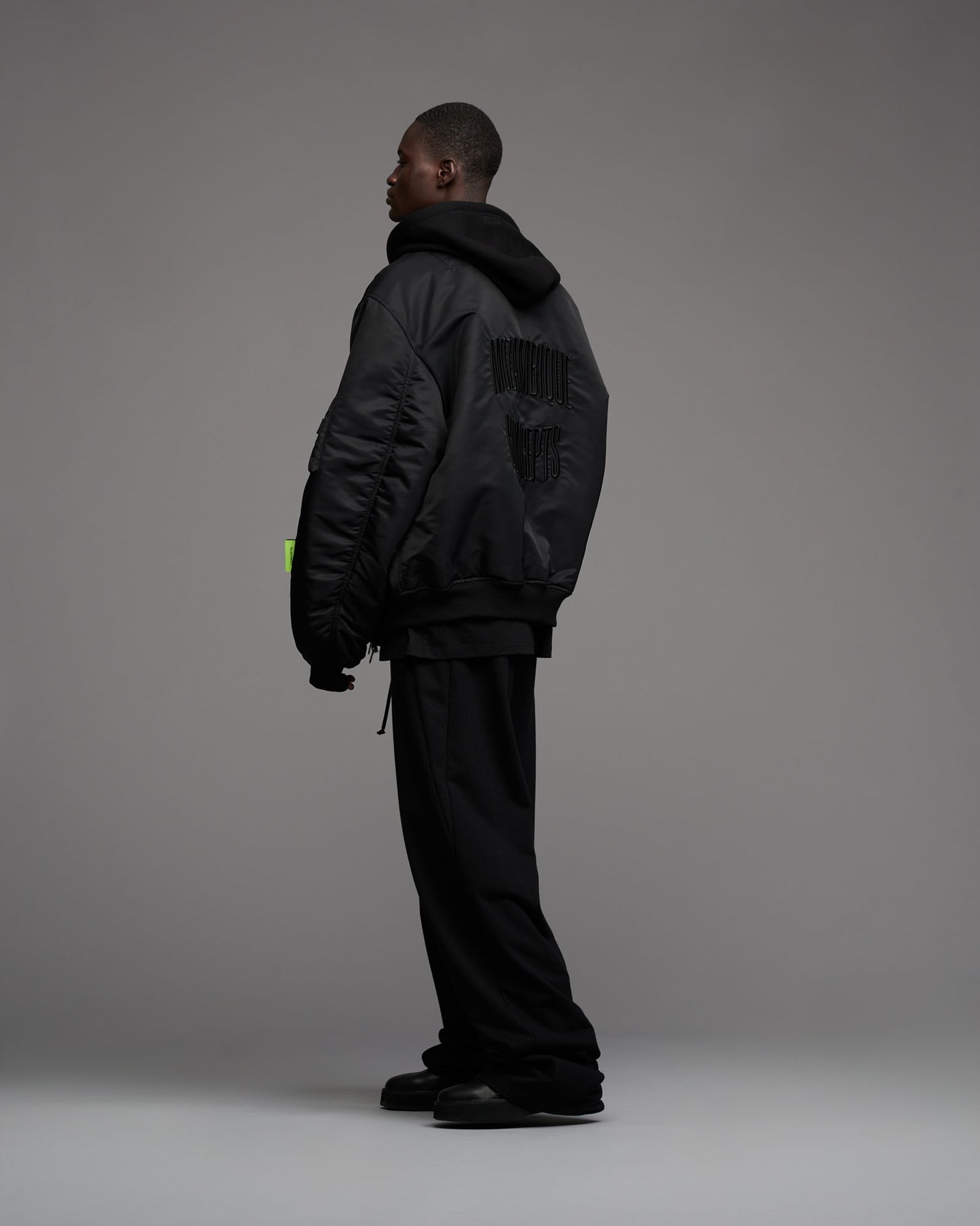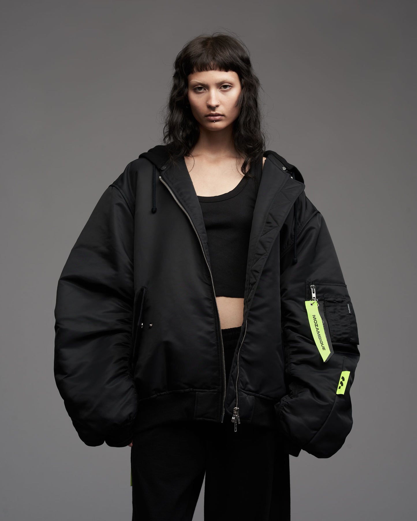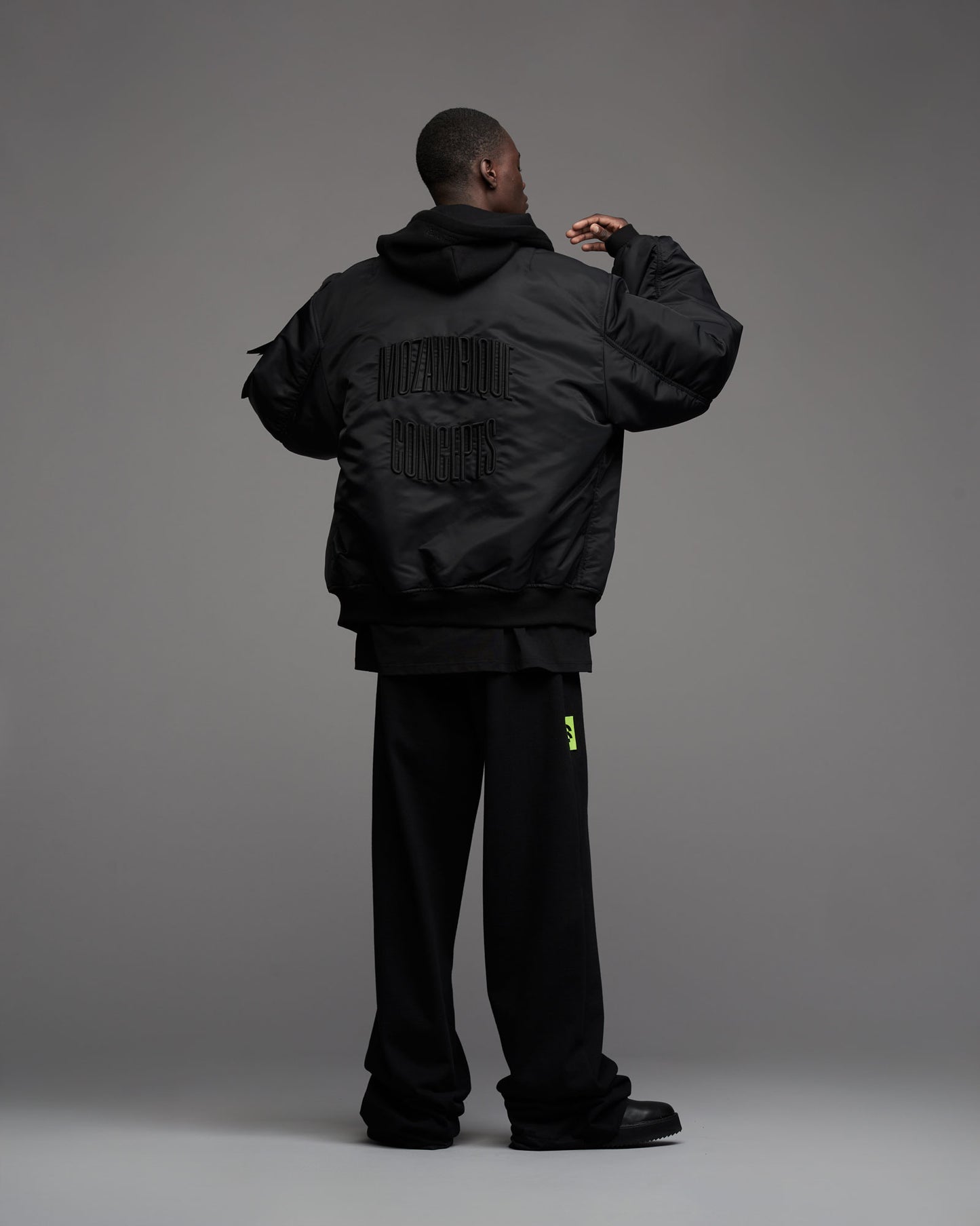 Oversized, padded bomber jacket in recycled tech fabric. Fully lined with inner pockets. Silver metallic two-way zipper in front. Multistitched inner placket. Detachable sweatshirt fabric hood. Tone in tone cord with knot endings in hood. "Mozambique Concepts" embroidery over back. Mozambique x Concepts embroidery tone in tone over front of hood. Mozambique x Concepts neon collaboration flag label stiched in left sleeve side seam. Sleeve pocket with "Mozambique", "Concepts" and "d'Odeur" zipper pullers printed on neon and black. Two front welt pockets. Rib cuffs.