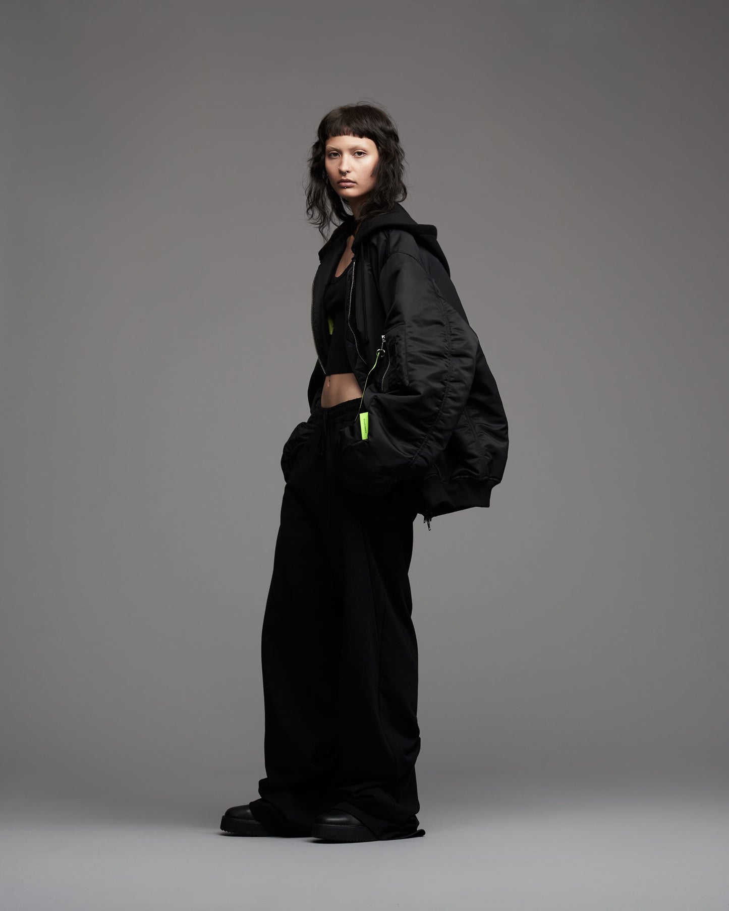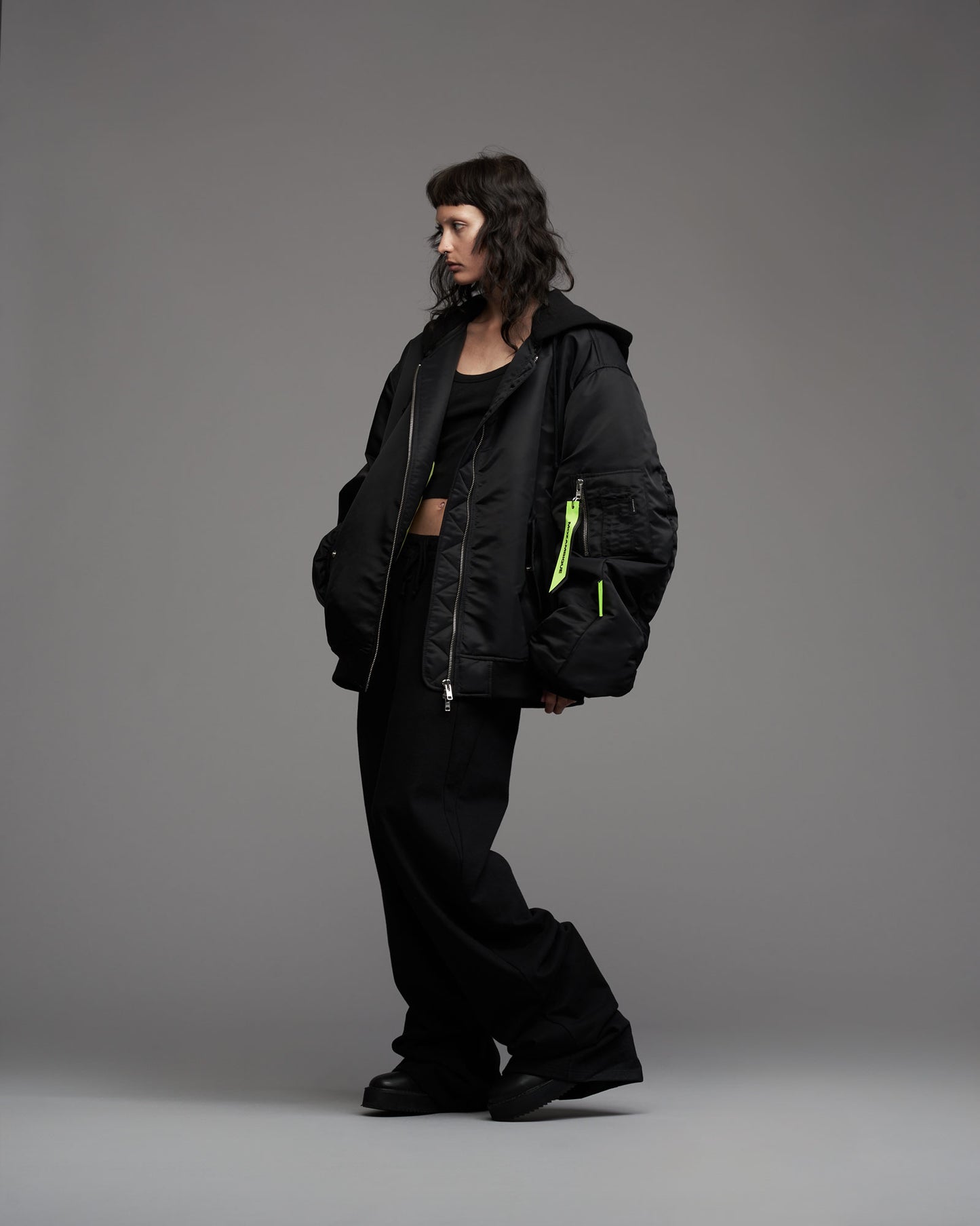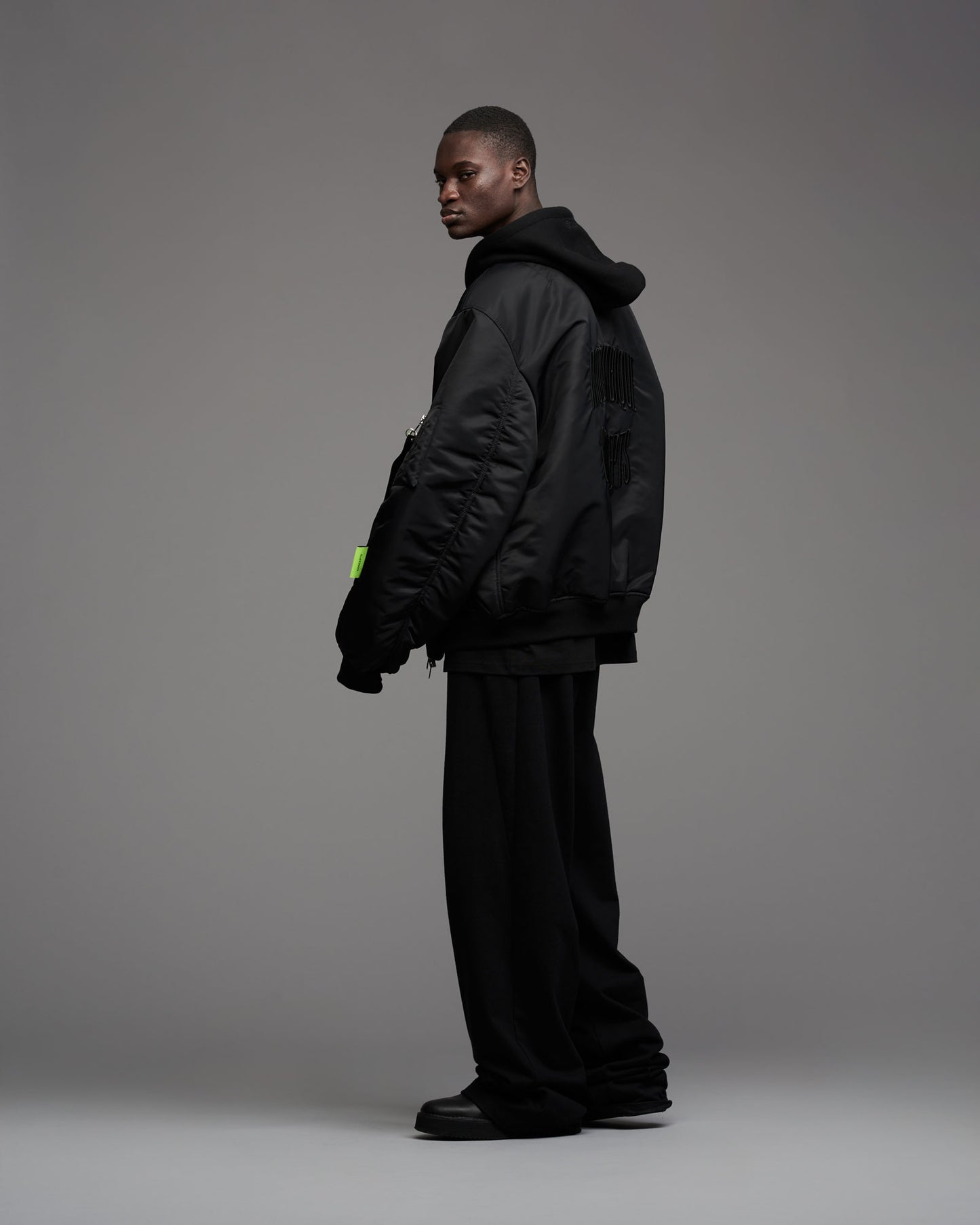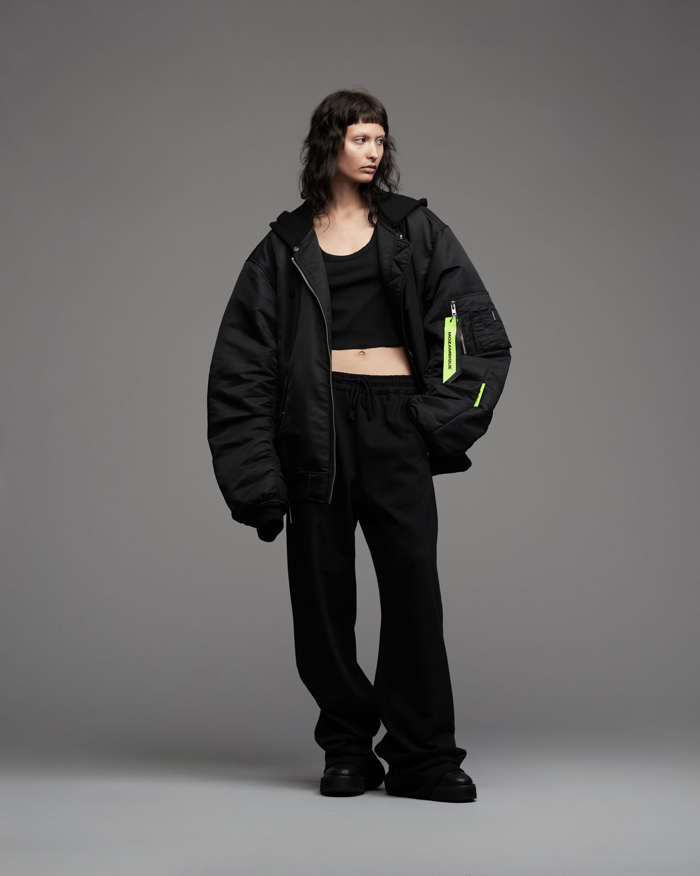 Oversized, padded bomber jacket in recycled tech fabric. Fully lined with inner pockets. Silver metallic two-way zipper in front. Multistitched inner placket. Detachable sweatshirt fabric hood. Tone in tone cord with knot endings in hood. "Mozambique Concepts" embroidery over back. Mozambique x Concepts embroidery tone in tone over front of hood. Mozambique x Concepts neon collaboration flag label stiched in left sleeve side seam. Sleeve pocket with "Mozambique", "Concepts" and "d'Odeur" zipper pullers printed on neon and black. Two front welt pockets. Rib cuffs.